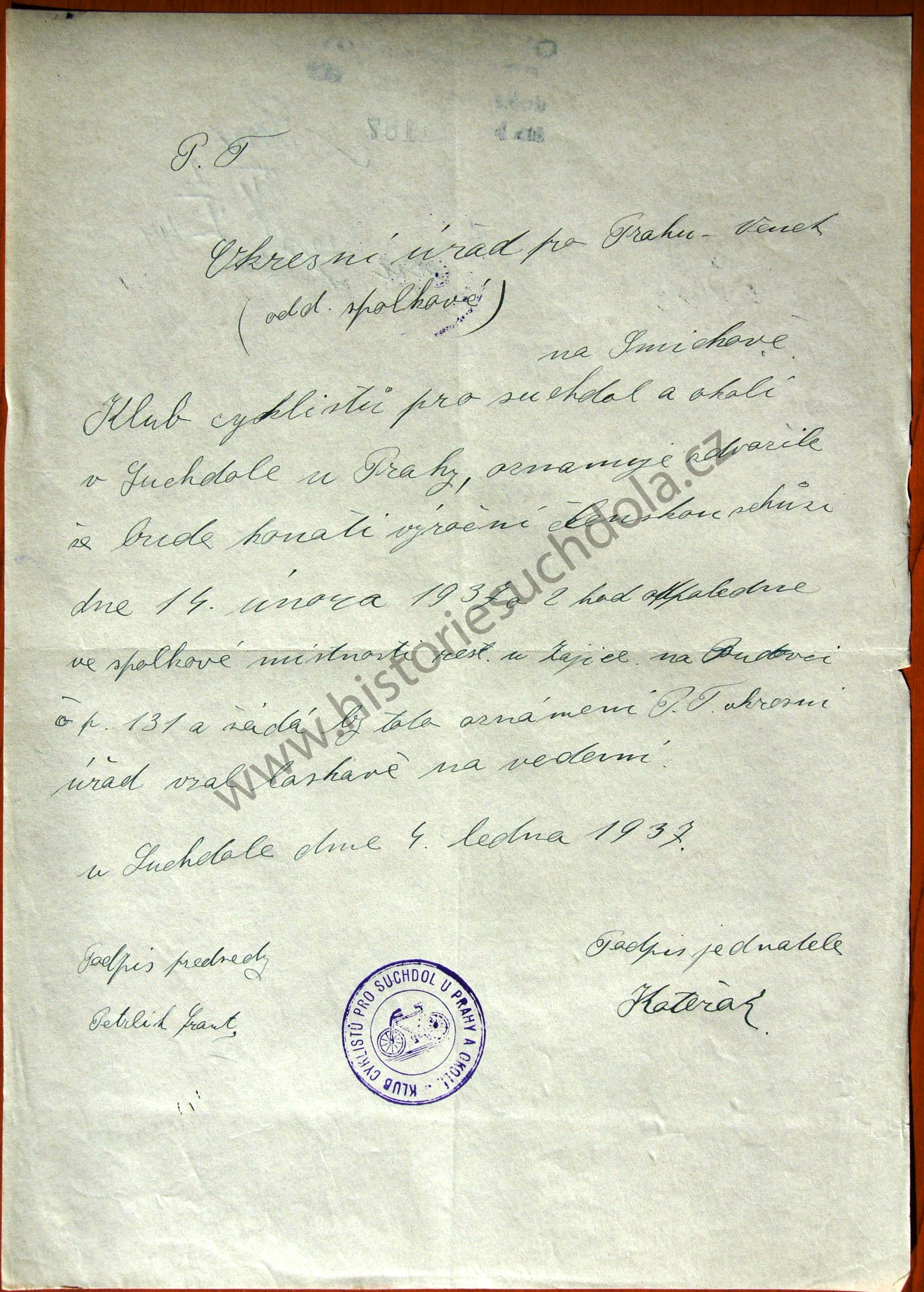 Svolání valné hromady, 14.2.1937 (SOkA Praha-západ, OÚ Praha-venkov).