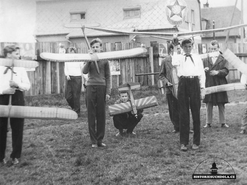 Modelářský kroužek, v podřepu Rudolf Zeman, asi 1960