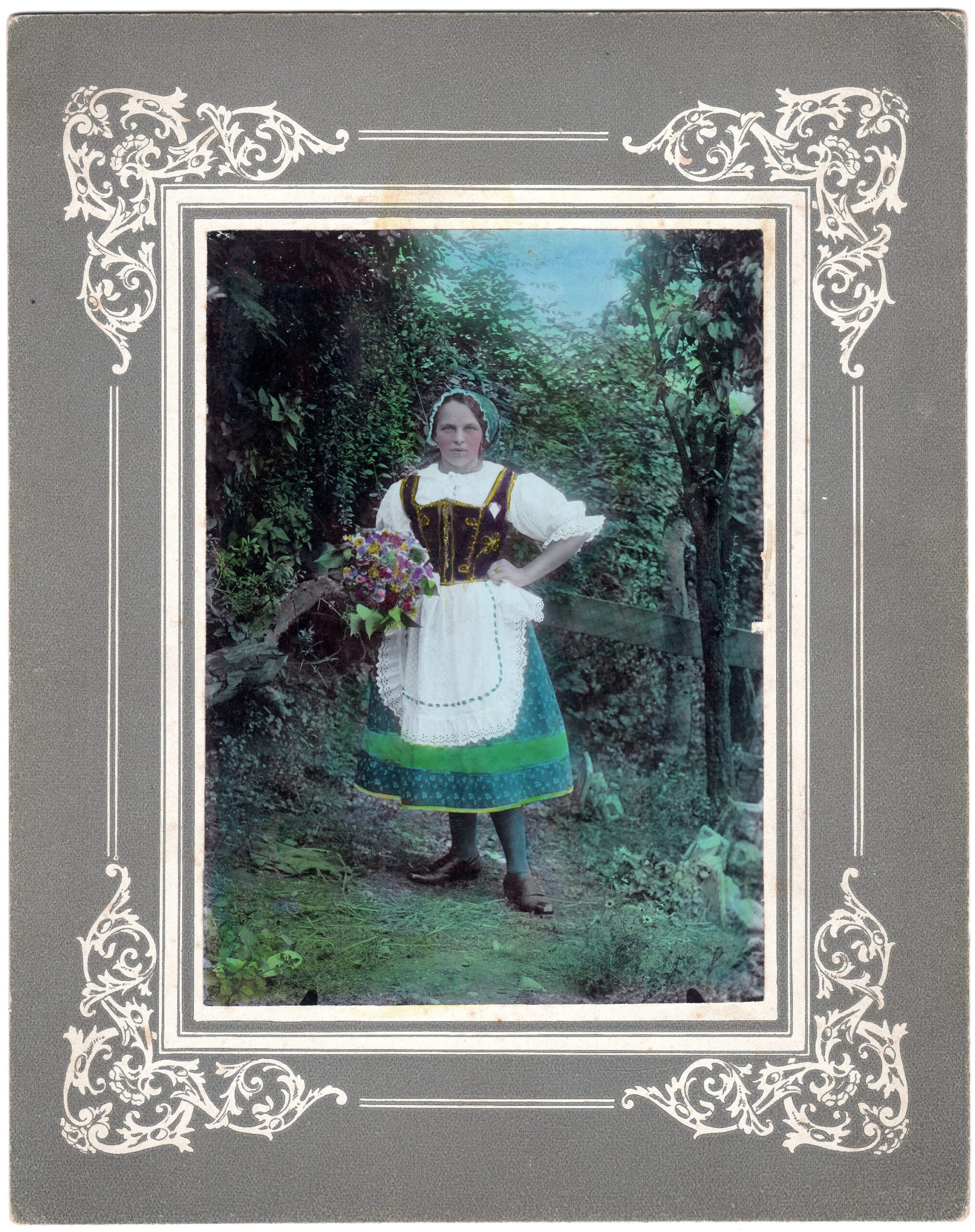 Fota datovaná 19.7.1914, slečna s květinami, Marie Kloudová, 19 let, kolorovaná fotografie. Sukně byla v originále červená.