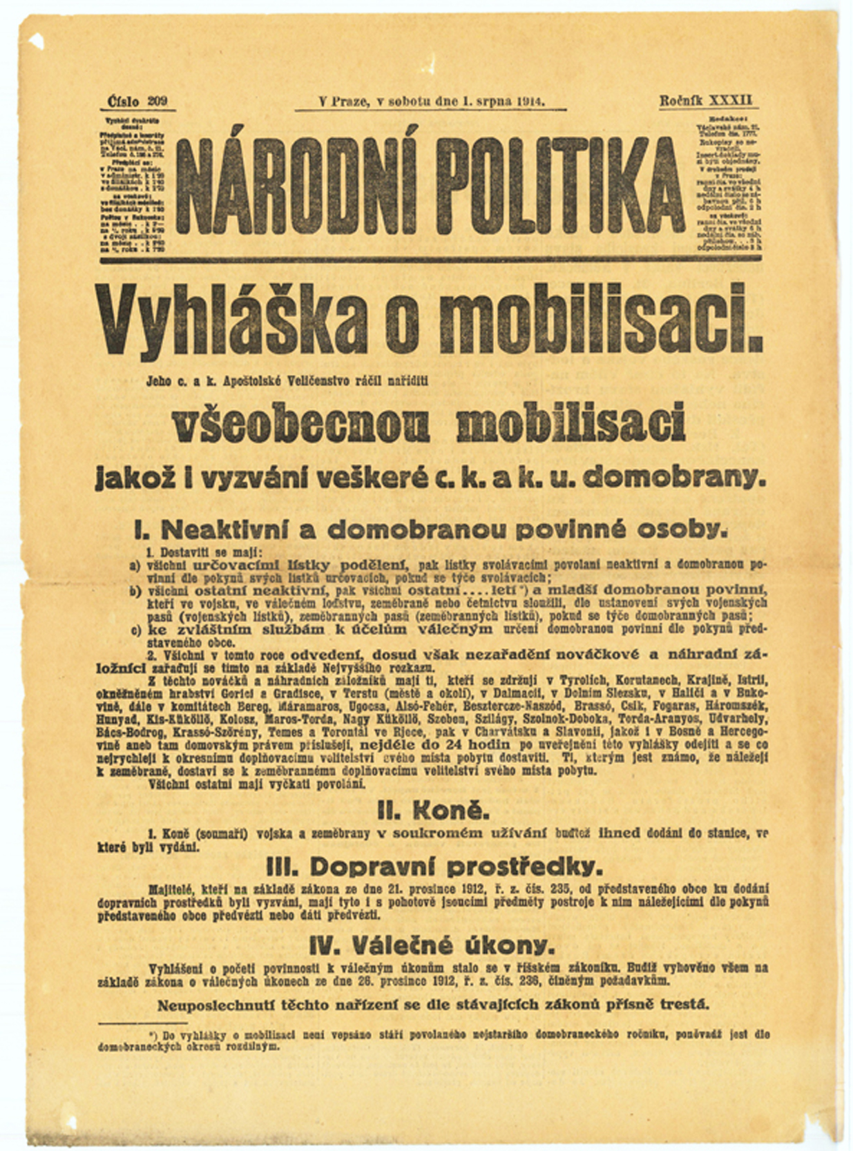 31.7.1914 vyhlášena všeobecná mobilizace.Vyhláška (vhu.cz).