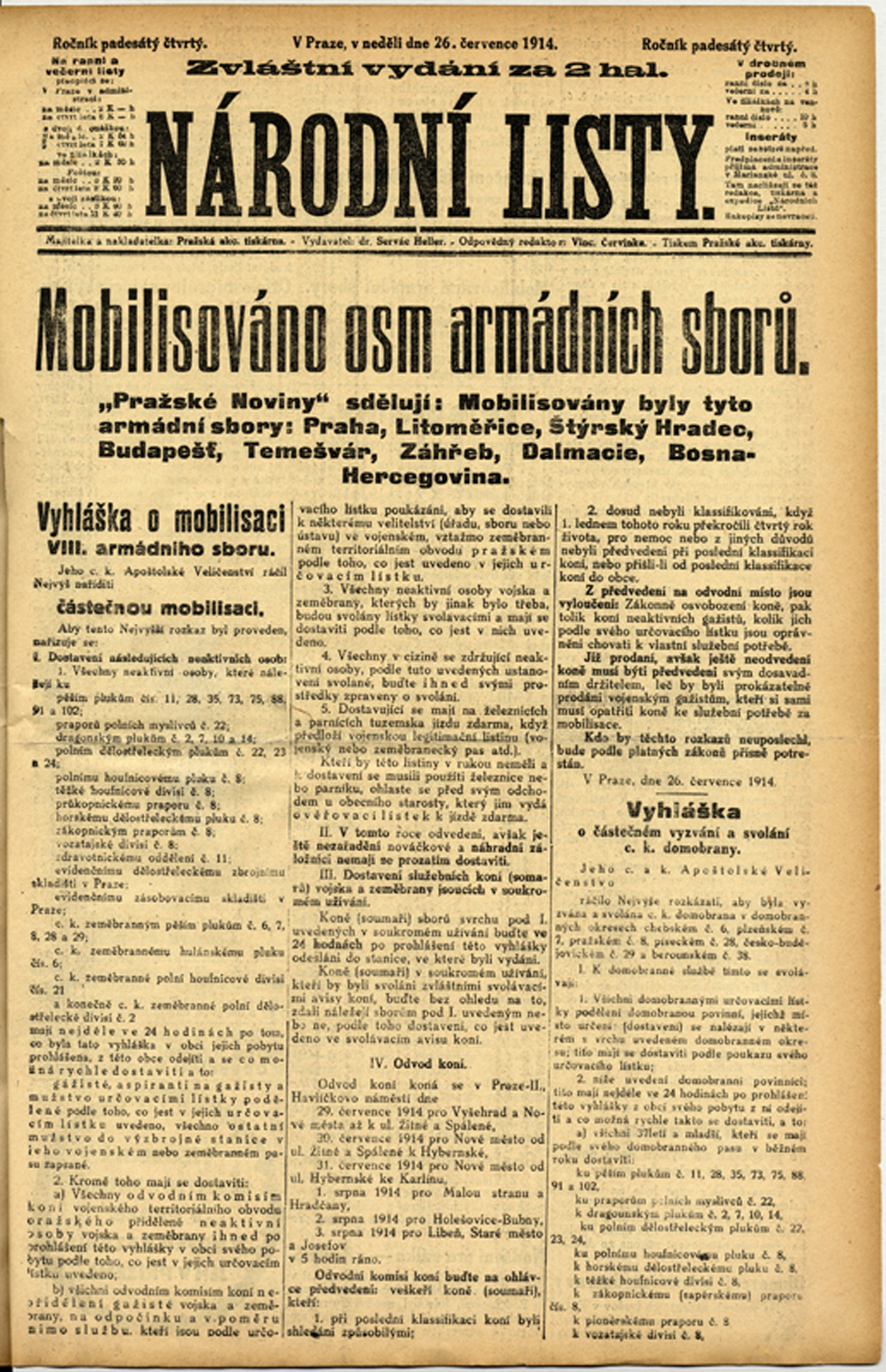 26.7.1914 vyhlášena částečná mobilizace Vyhláška (vhu.cz).