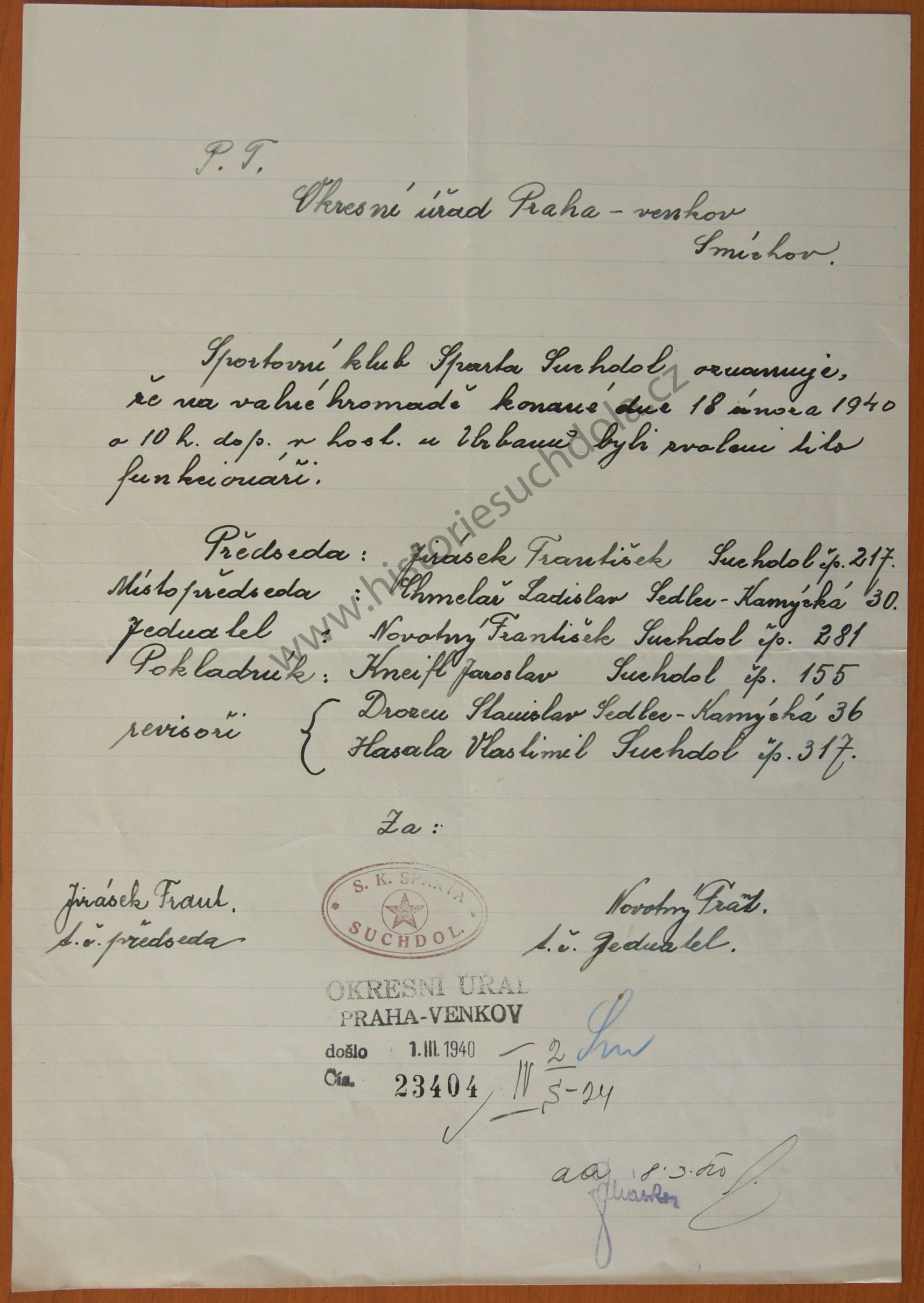 SK Sparta funkcionáři 18.2.1940 (SOkA Praha západ, OÚ Praha venkov).