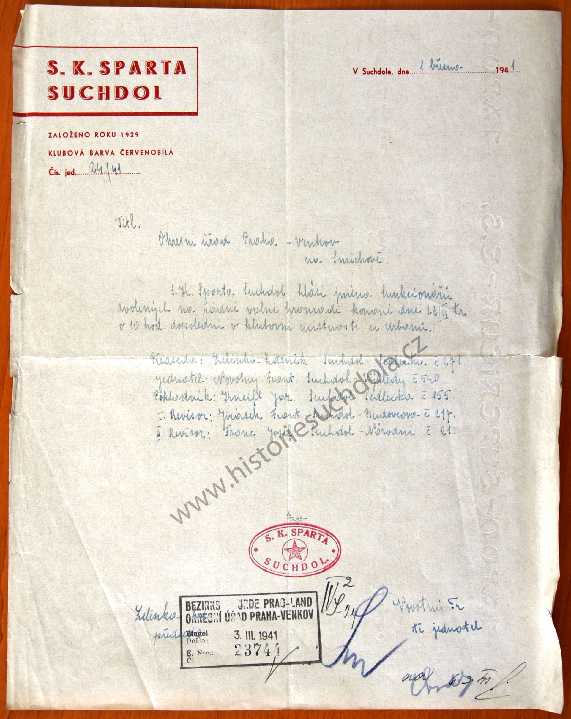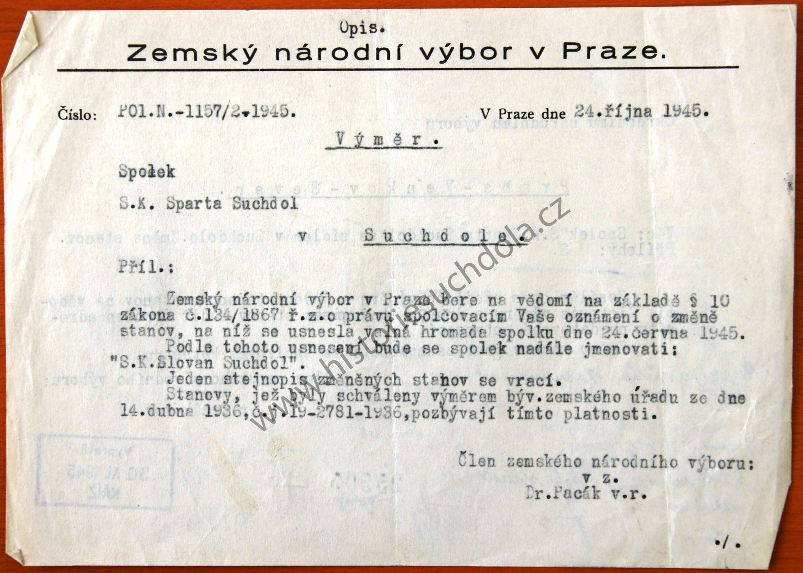 Povoleni sloučeni SK Suchdol a SK Sparta Suchdol 27.10.1945 (L Laška).
