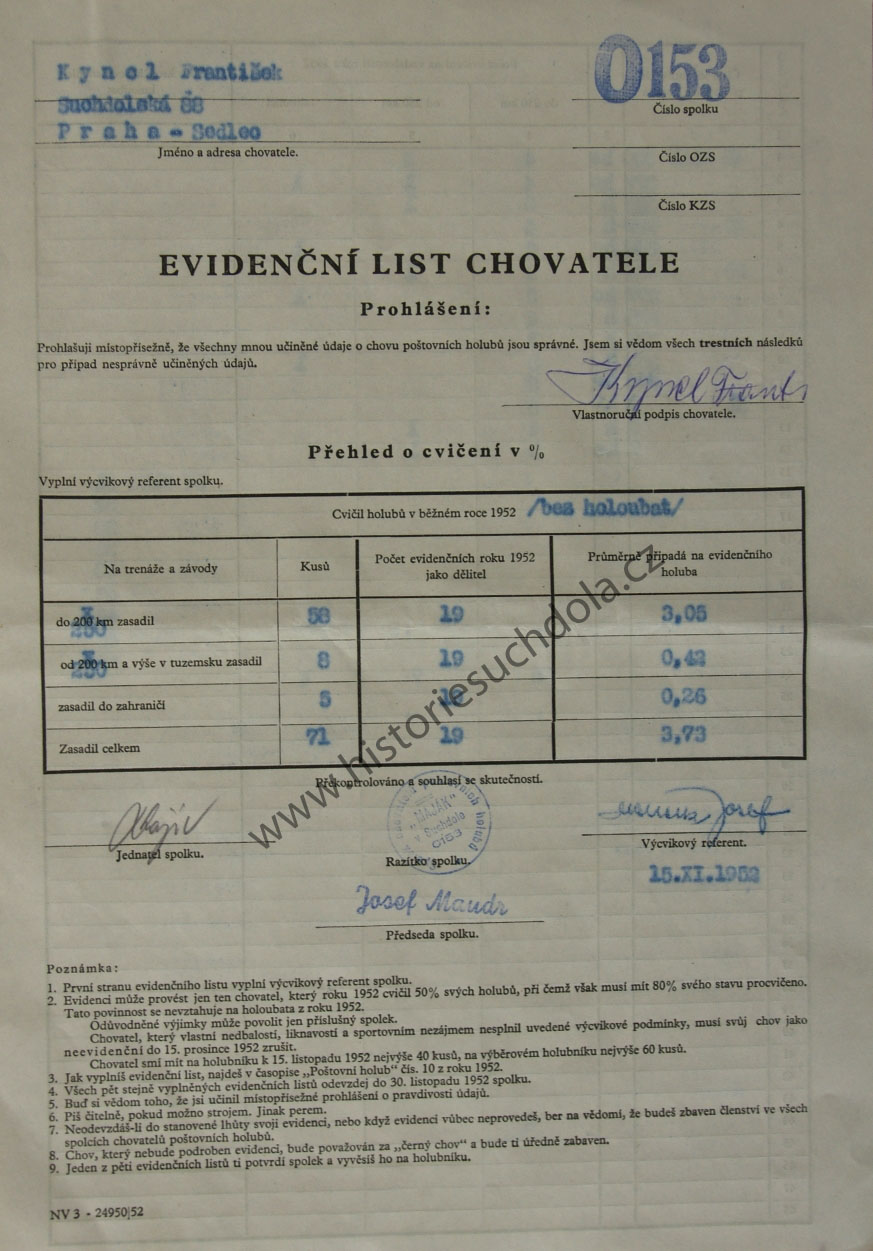 Evidenční list 15.11.1952 (SOkA Praha-západ, OÚ Praha venkov).