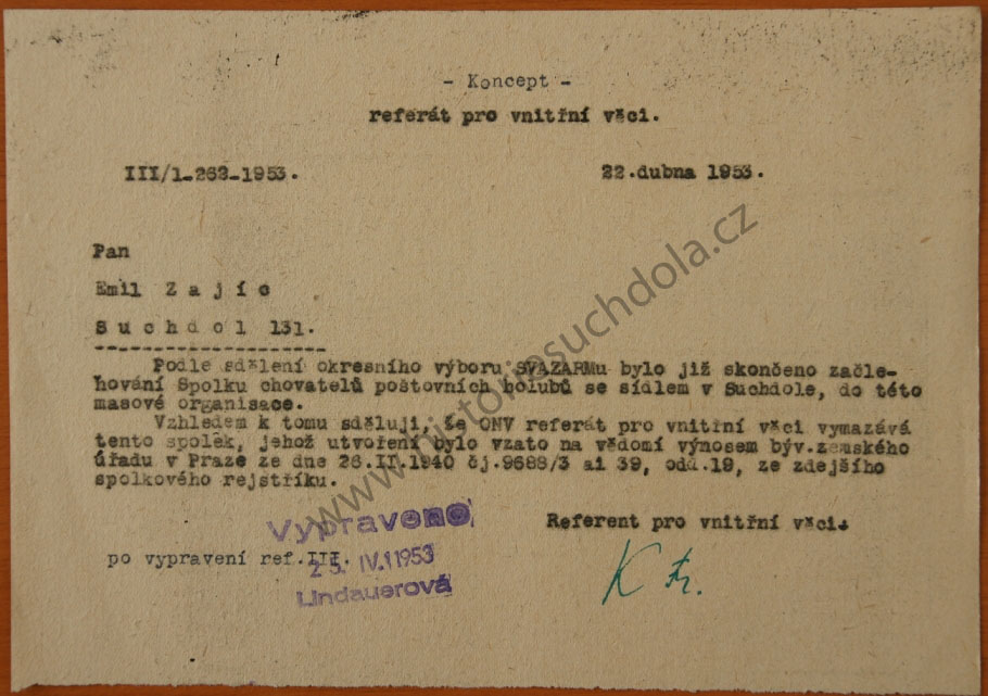 Vymazání spolku a začlenění do Svazarmu 22.4.1953 (SOkA Praha-západ, OÚ Praha venkov).
