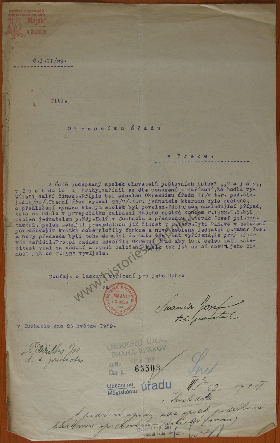 Vysvětlení doby vzniku 25.5. 1939 (SOkA Praha-západ, OÚ Praha venkov).