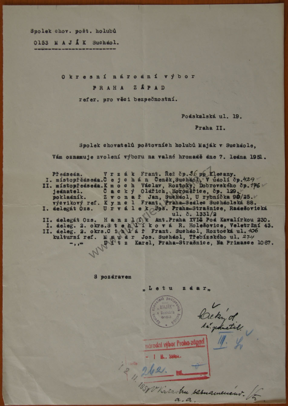 Výbor spolku 7.1.1951 (SOkA Praha-západ, OÚ Praha venkov).
