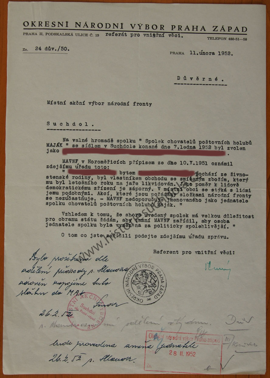 Zbavení funkce 11.2.1952 (SOkA Praha-západ, OÚ Praha venkov).
