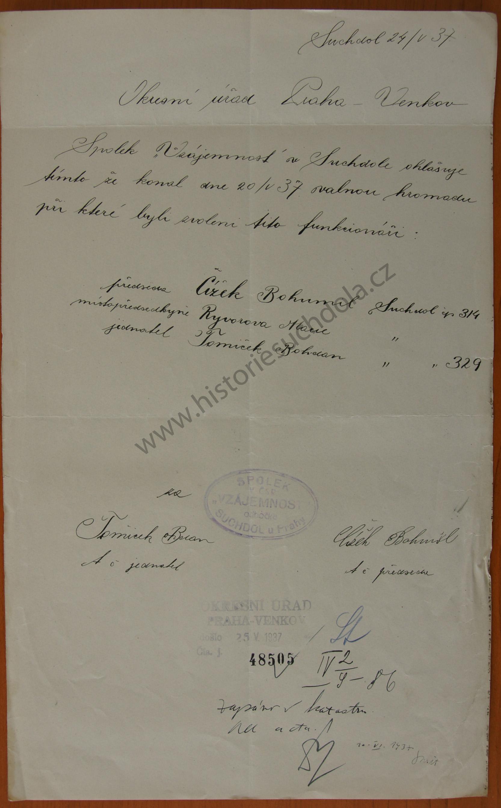 Zvolení funkcionáři, 20.5.1937 (SOkA Praha-západ, OÚ Praha venkov).