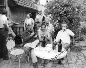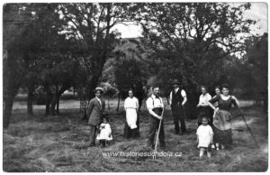Fotografie z natáčení, sedící uprostřed- Jiří Karel, majitel statku
